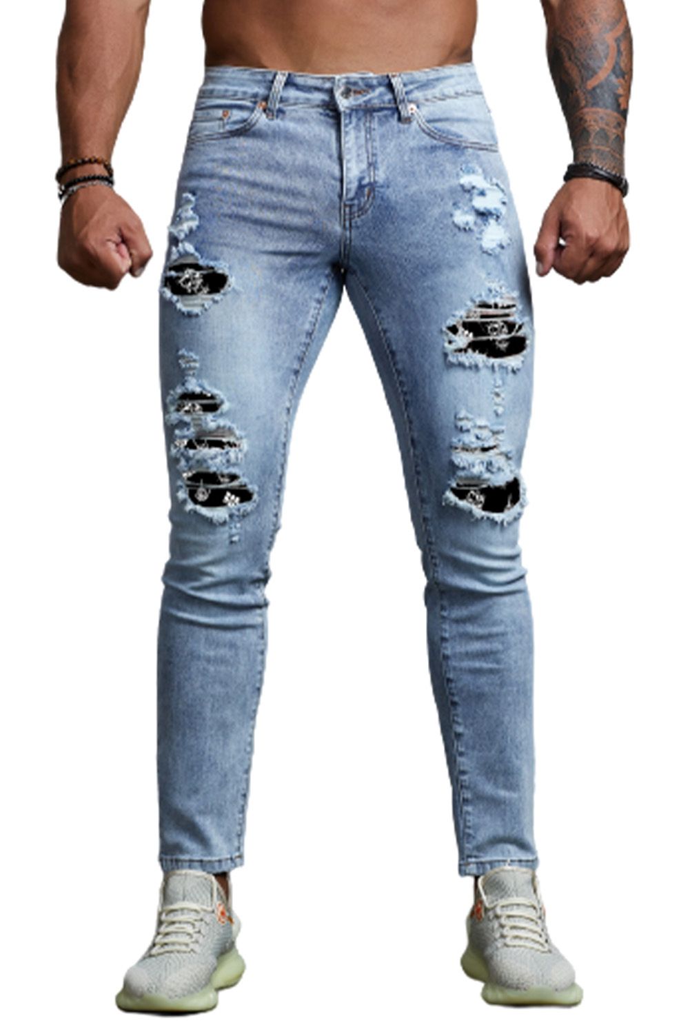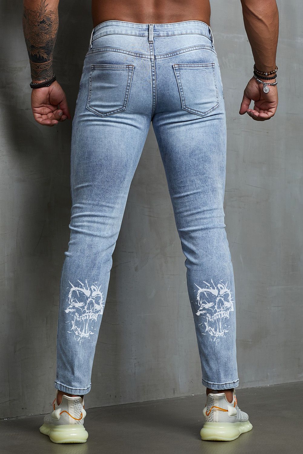 Light Wash Skull Print Patchwork Frayed Slim Fit Men's Jeans